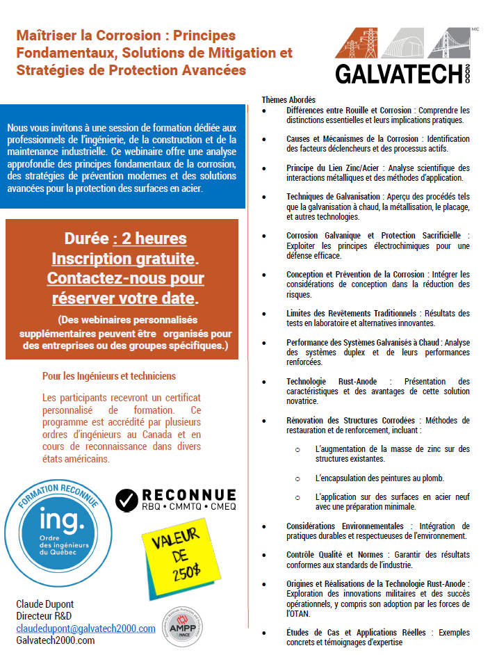 Une formation / présentation gratuite (1 ou 2 h) sur la corrosion de l’acier et du zinc avec attestation de formation est disponible sur demande.